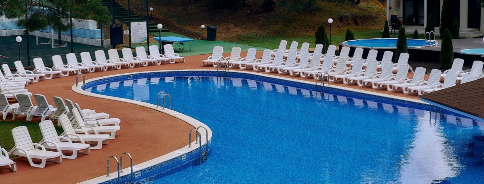 Для гостей и посетителей есть большой открытый бассейн, в котором поддерживается комфортная температура воды. Площадь бассейна составляет целых 400 кв.м.!